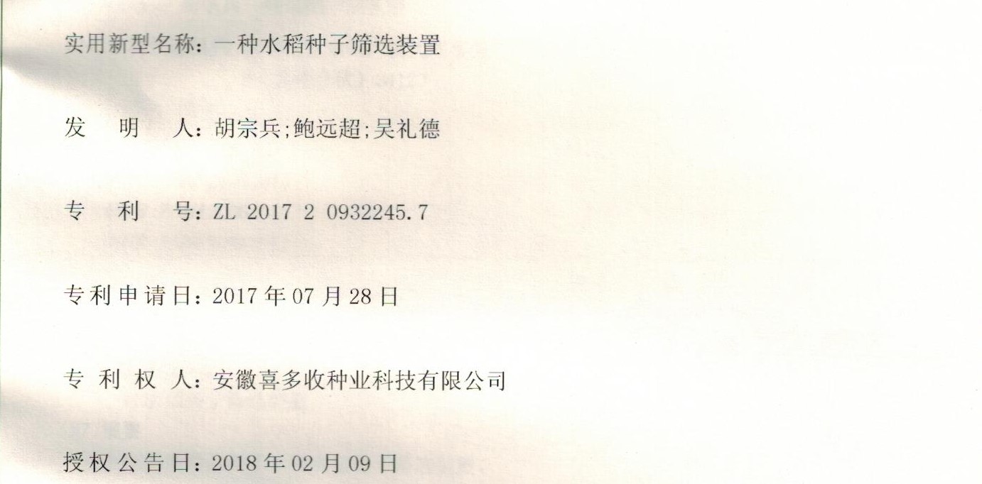 實(shí)用新型專利《一種水稻種子篩選裝置》授權(quán)證書