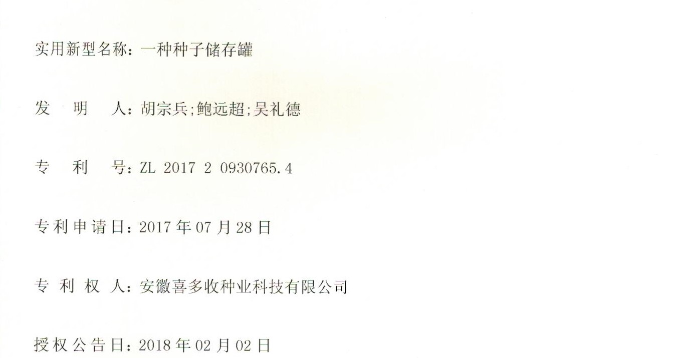 實(shí)用新型專(zhuān)利《一種種子儲(chǔ)存罐》授權(quán)證書(shū)
